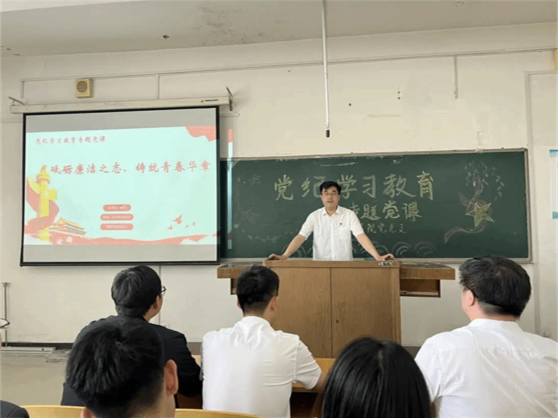 为深入学习贯彻习近平总书记关于全面加强党的纪律建设的重要论述,深刻认识《中国共产党纪律处分条例》主旨要义,推进党纪学习教育走深走实,加强学院师生党员的纪律意识,6月20日,在业精楼中501教室,tyc122cc太阳成集团党总支书记鲍宇做题为“砥砺廉洁之志,铸就青春华章”的党纪学习教育专题党课。本次专题党课由tyc122cc太阳成集团学生第一党支部书记张诗彤主持,tyc122cc太阳成集团师生党员参加。