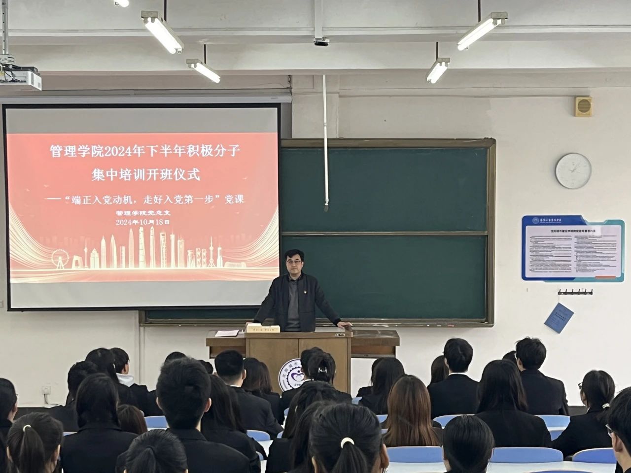 为深入学习党的二十届三中全会精神,做好党员发展教育培训工作,强化入党积极分子的思想觉悟和理论素养。根据我校《关于开展2024年下半年入党积极分子集中培训的通知》的相关要求,10月18日下午,tyc122cc太阳成集团党总支在业精楼A403举办2024年下半年入党积极分子培训班开班仪式。学院党总支书记鲍宇出席会议并作“端正入党动机,走好入党第一步”的开班报告,会议由学生第二党支部书记孙斯慧主持,各学生党支部书记及本期全体入党积极分子参加培训。