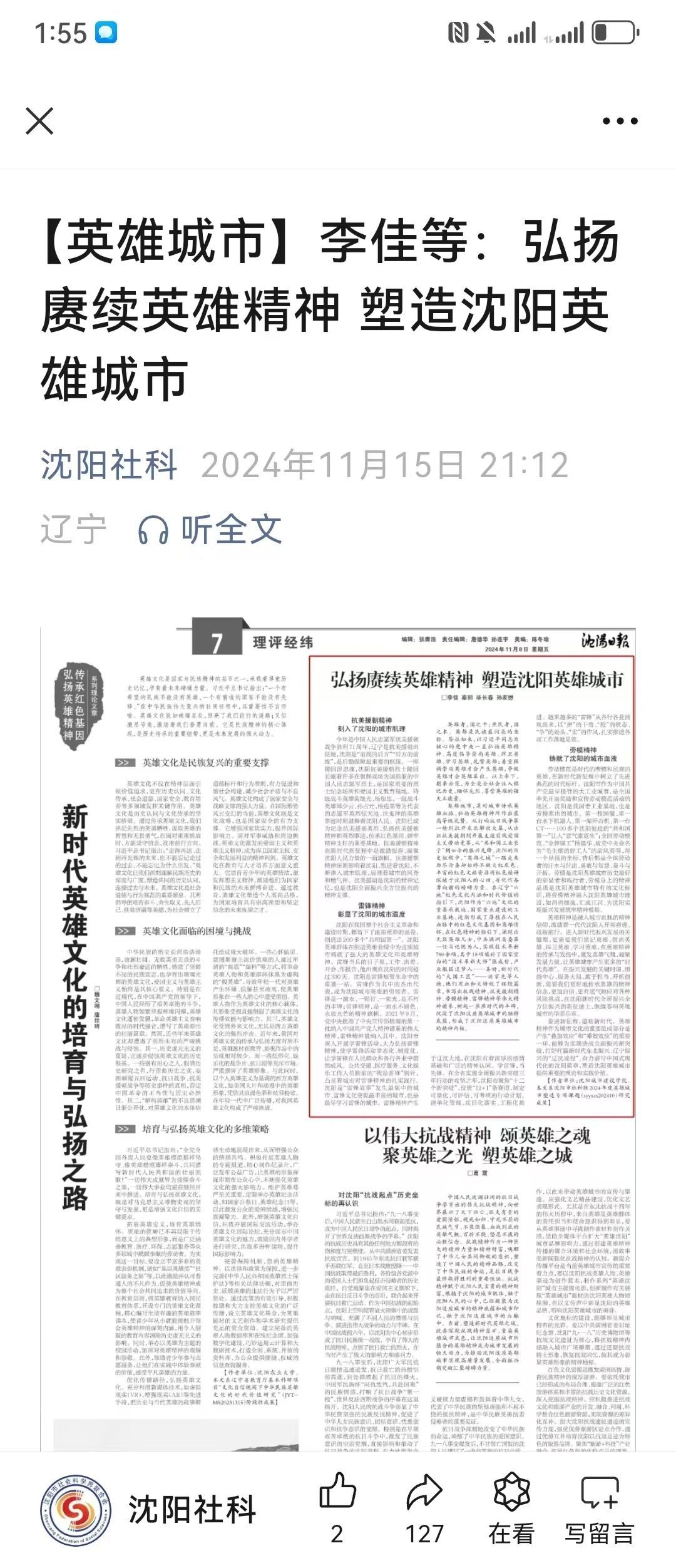 11月8日,沈阳日报刊登了我校tyc122cc太阳成集团李佳、毕长春、孙佳懋、秦丽共同执笔撰写的文章《弘扬赓续英雄城市 塑造沈阳英雄城市》,该文章系沈阳市社科联2024年度英雄城市塑造专项课题(syyxcs202410)研究成果,同时沈阳社会科学界联合会官方公众号公开发表。这不仅是对我校教师学术研究成果的肯定,更是对沈阳这座城市深厚历史底蕴与时代精神的颂扬。