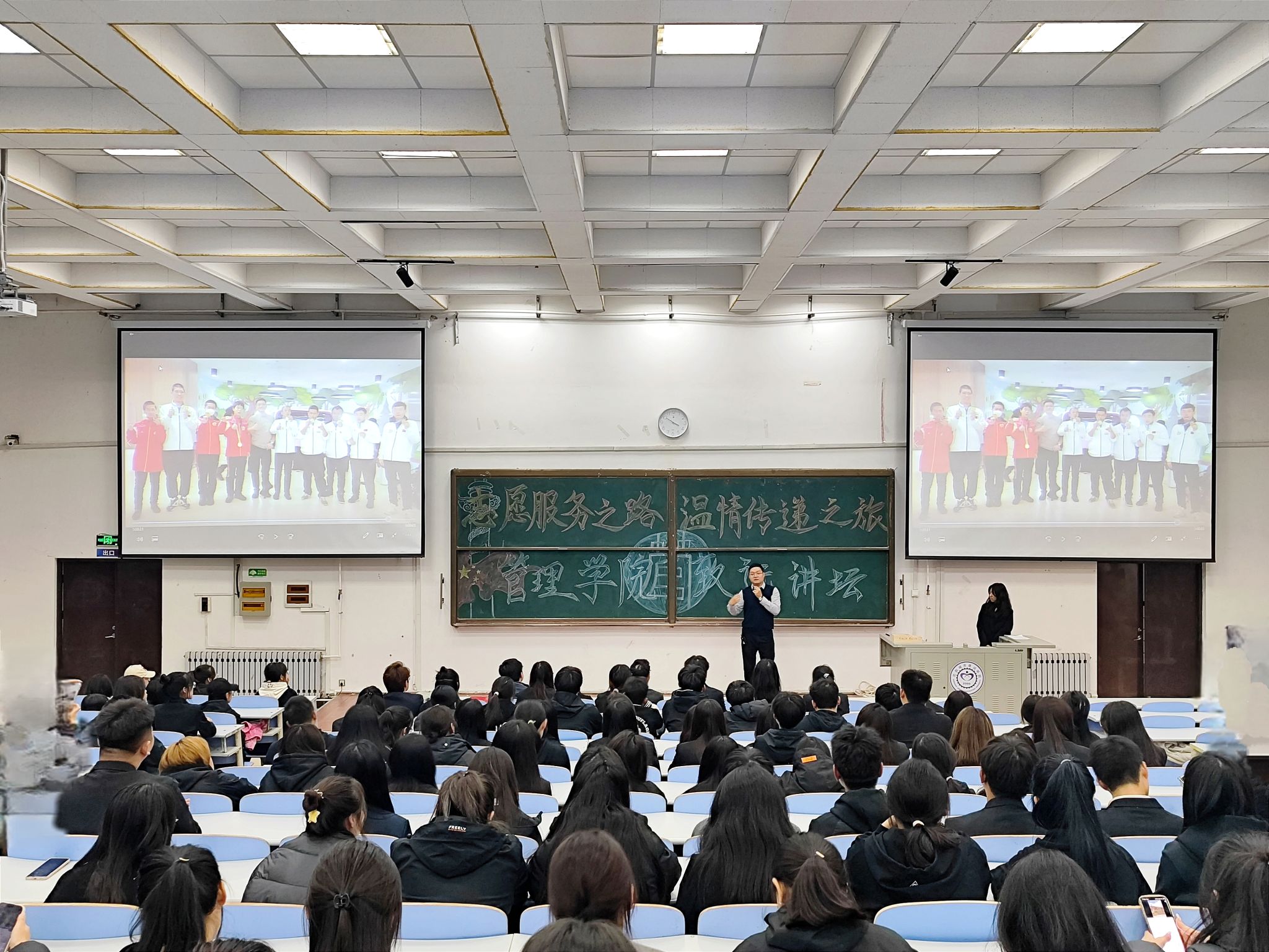 聘任仪式结束后,赵强为参会师生作题为《志愿服务之路,温情传递之旅》的精彩报告。报告中讲述了本就是残疾人的他如何通过自强不息走在扶残助残帮扶第一线,以实际行动关心帮助残疾人群体,维护残疾人群体合法权益的事迹。赵强精彩的分享生动地诠释了无私奉献、恪尽职守、全心全意为人民服务的志愿服务精神,引发现场师生的阵阵掌声。