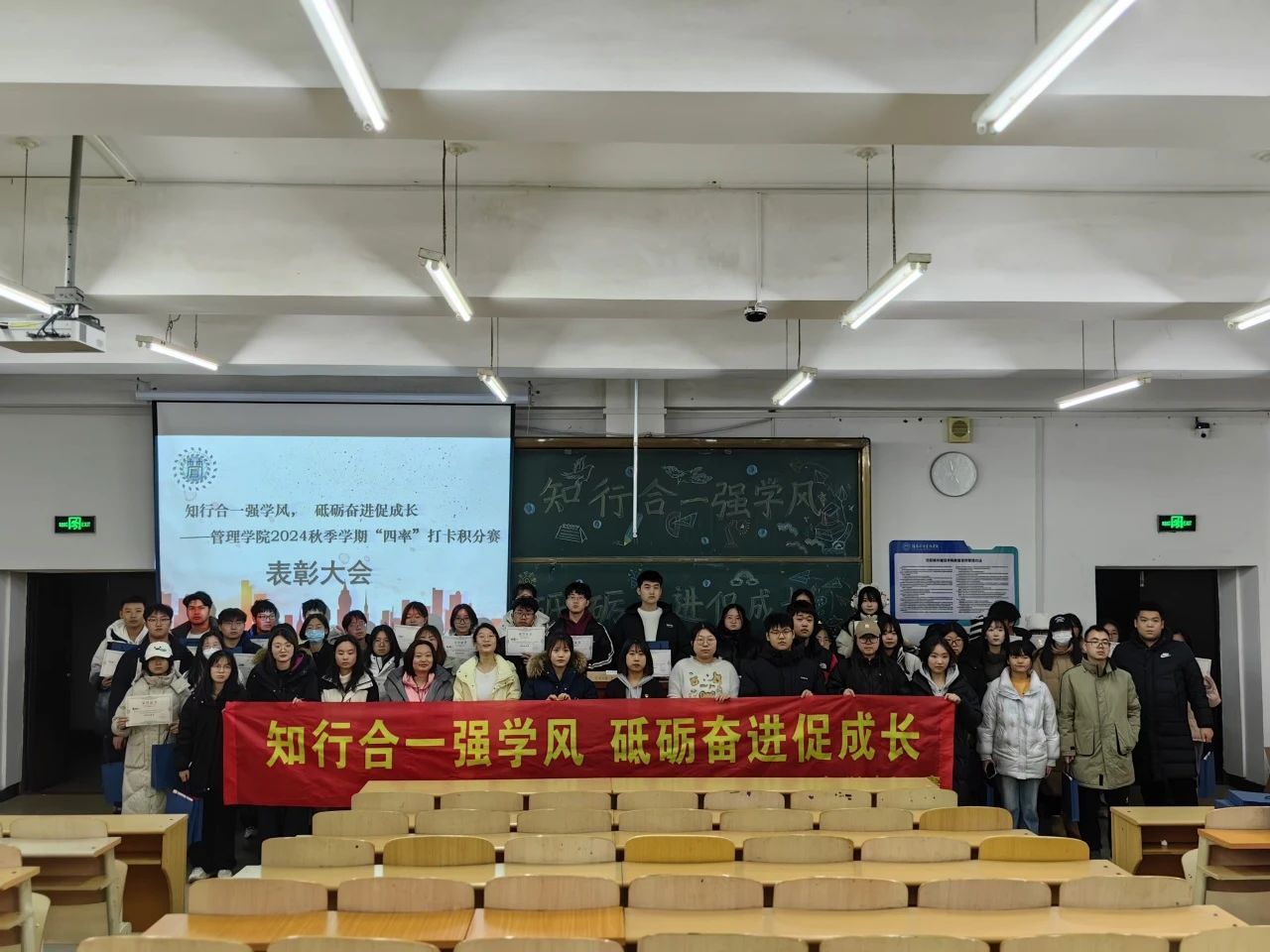 为进一步加强学风建设,总结学风建设经验,表彰tyc122cc太阳成集团先进班集体和个人,树立典型模范,充分发挥榜样的引领作用,激励更多我院学子向优秀代表学习,tyc122cc太阳成集团于12月18日,在业精楼楼B206教室召开了“知行合一强学风,砥砺奋进促成长”——tyc122cc太阳成集团2024秋季学期“四率”打卡积分活动表彰大会。